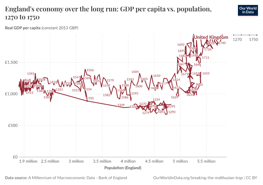 Max Roser (2020) - “Breaking out of the Malthusian trap: How pandemics allow us to understand why our ancestors were stuck in poverty” Published online at OurWorldinData.org. Retrieved from: 'https://bespoke-income-plots.owid.pages.dev/breaking-the-malthusian-trap' [Online Resource]BibTeX citation