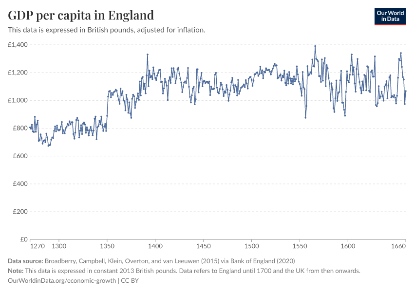 The data shown here is taken from Broadberry, Stephen, Bruce Campbell, Alexander Klein, Mark Overton and Bas van Leeuwen (2015) – British Economic Growth 1270-1870 Cambridge: Cambridge University Press. https://doi.org/10.1017/CBO9781107707603