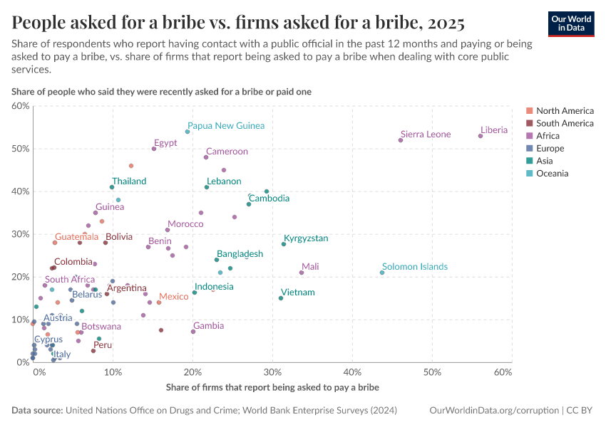 In many other places, however, bribery is far more common. In some countries, more than half of those interacting with public officials report being asked for a bribe or paying one.