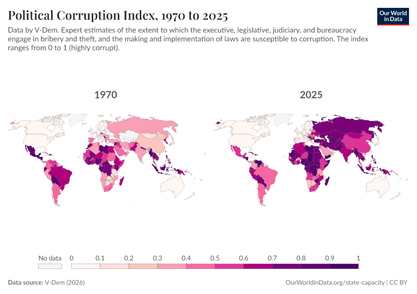 The maps show how V-Dem’s experts assess political corruption in 1970 compared to the present. Experts identify increases in corruption in some countries and decreases in others. You can explore specific countries by switching to the line chart. But, importantly, you should keep in mind that no single measure can fully tell us the story of how corruption changes over time.