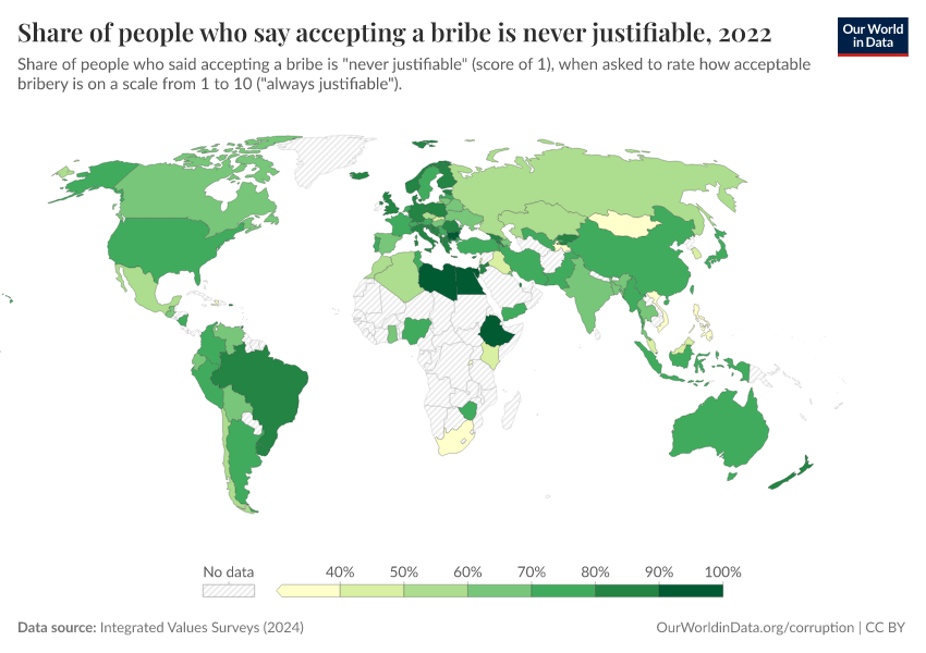 The map below shows data from the Integrated Values Surveys on how people from different countries feel about bribery. They were asked to rate how justifiable they think it is to accept a bribe, using a scale from 1 (never justifiable) to 10 (always justifiable). The chart shows the share of people in each country who selected a score of 1, believing that accepting a bribe is never justifiable.