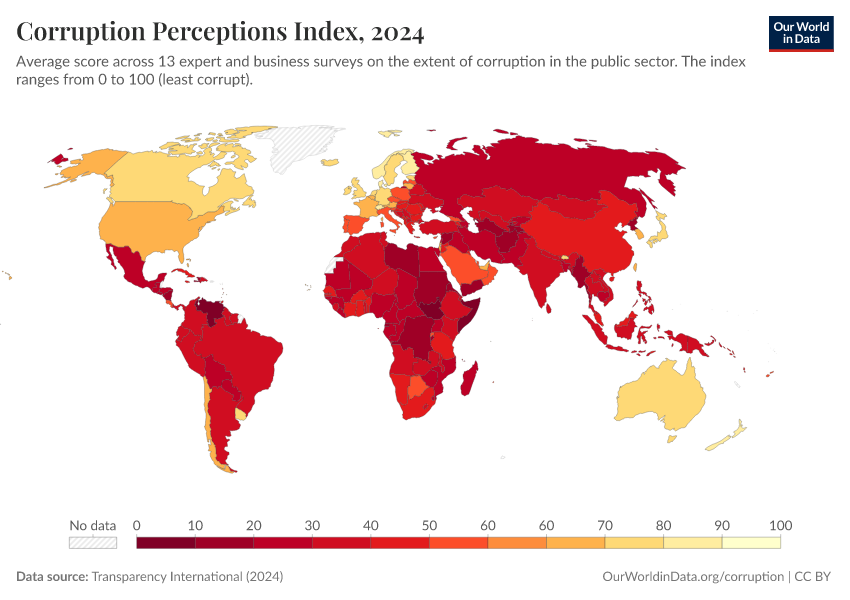 This page presents data and visualizations on how corruption is measured, how it differs across countries, and how it may have changed over time. We also discuss the strengths and limitations of different sources. While no single dataset can fully capture such a complex issue, we highlight when each source might be most informative.