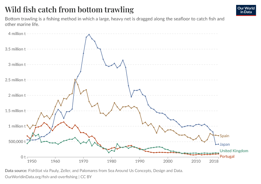 In contrast, bottom trawling is becoming less common across Europe. In many countries – such as the UK, Spain, and Portugal – bottom trawling was intense throughout the 1950s, 60s, and 70s but has since declined significantly. That has been partly driven by efforts to reduce overfishing and allow fish stocks to rebuild. In addition, the European Commission banned bottom trawling in deep waters – those below 800m in depth – in 2016.