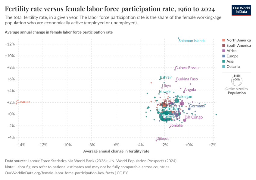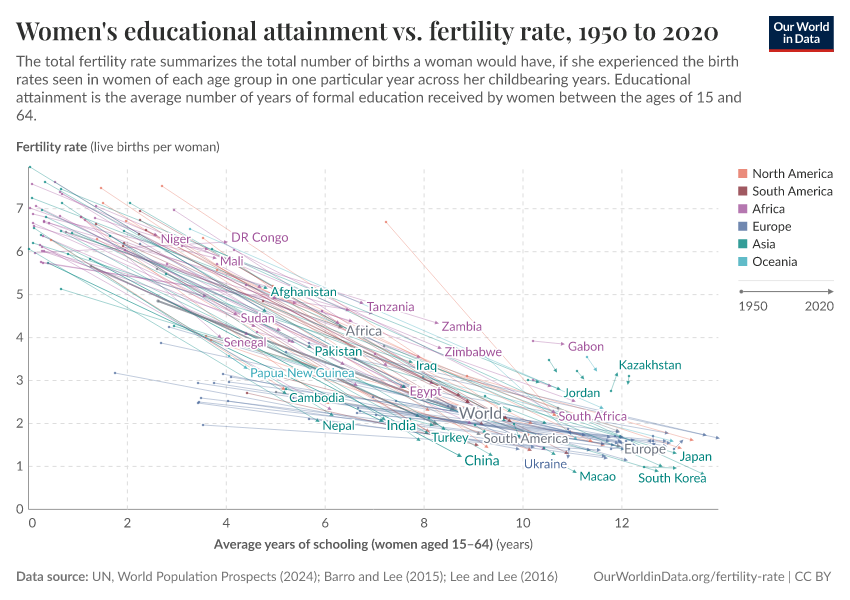 Have a look at Iran — in 1950, when Iranian women had on average only a third of a year of schooling, the fertility rate was around 7 children per woman. By 2020, when Iranian women had on average nine years of schooling, the fertility rate was below two (yes, the fertility rate in Iran is now similar to the figure in the US).