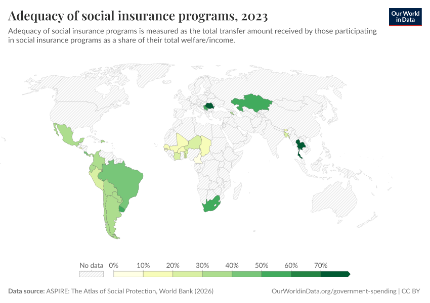 “Data Page: Adequacy of social insurance programs”. Our World in Data (2026). Data adapted from ASPIRE: The Atlas of Social Protection, World Bank. Retrieved from https://bespoke-income-plots.owid.pages.dev/grapher/adequacy-of-social-insurance-programs [online resource]How to cite this data