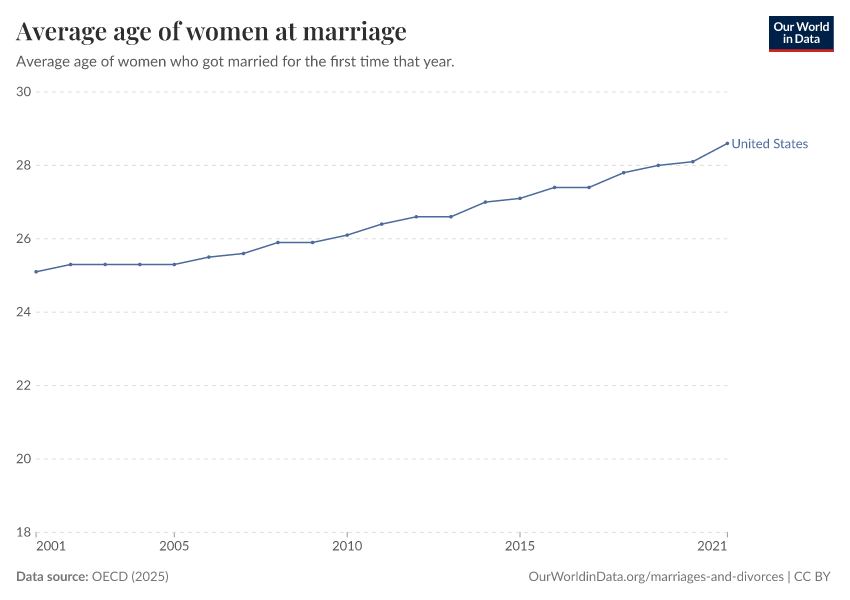 “Data Page: Average age of women at marriage”, part of the following publication: Bastian Herre, Veronika Samborska, Esteban Ortiz-Ospina, and Max Roser (2020) - “Marriages and Divorces”. Data adapted from OECD. Retrieved from https://bespoke-income-plots.owid.pages.dev/grapher/age-at-marriage-women [online resource]How to cite this data