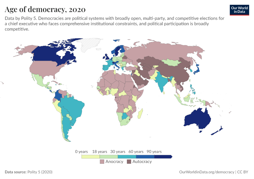 “Data Page: Age of democracy”, part of the following publication: Bastian Herre, Lucas Rodés-Guirao, and Esteban Ortiz-Ospina (2013) - “Democracy”. Data adapted from Polity 5. Retrieved from https://bespoke-income-plots.owid.pages.dev/grapher/age-of-democracy-polity [online resource]How to cite this data