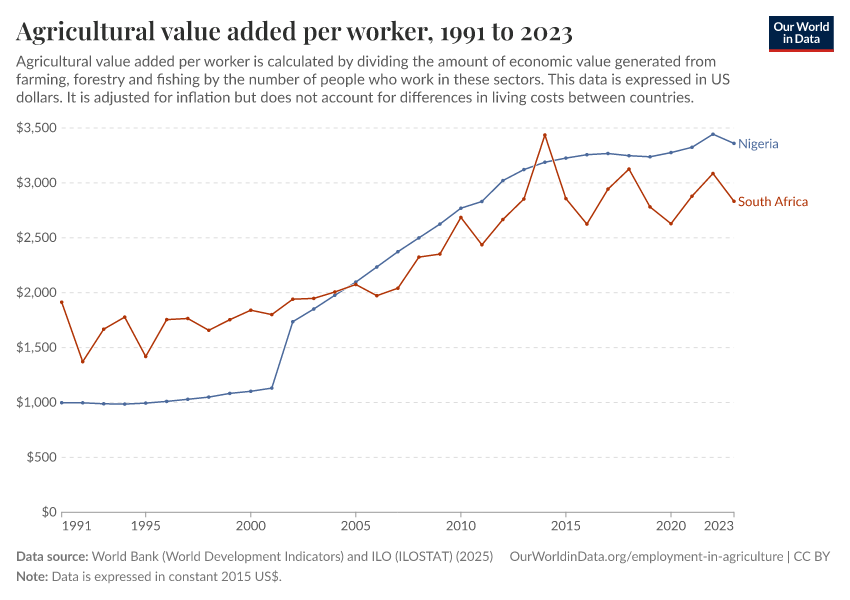 World Bank (World Development Indicators) and ILO (ILOSTAT) (2025) – processed by Our World in Data. “Agricultural value added per worker” [dataset]. World Bank (World Development Indicators) and ILO (ILOSTAT), “World Development Indicators 122” [original data]. Retrieved March 12, 2026 from https://bespoke-income-plots.owid.pages.dev/grapher/agriculture-value-added-per-worker-wdi