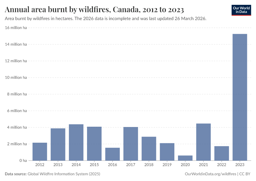 “Data Page: Annual area burnt by wildfires”, part of the following publication: Hannah Ritchie, Pablo Rosado, and Veronika Samborska (2024) - “Climate Change”. Data adapted from Global Wildfire Information System. Retrieved from https://bespoke-income-plots.owid.pages.dev/grapher/annual-area-burnt-by-wildfires [online resource]How to cite this data