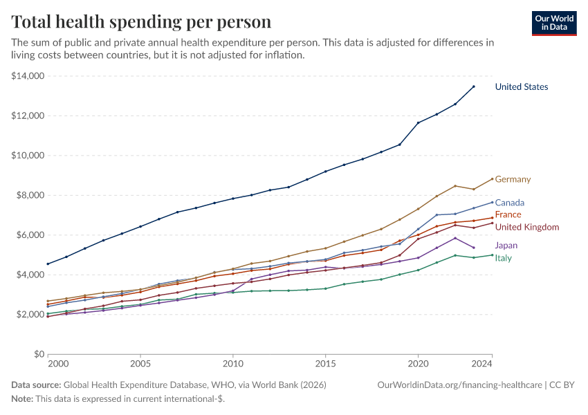 “Data Page: Total health spending per person”. Our World in Data (2026). Data adapted from Global Health Expenditure Database, WHO, via World Bank. Retrieved from https://bespoke-income-plots.owid.pages.dev/grapher/annual-healthcare-expenditure-per-capita [online resource]