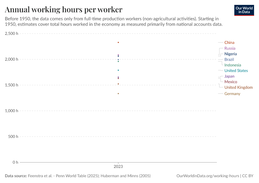 “Data Page: Annual working hours per worker”, part of the following publication: Charlie Giattino, Esteban Ortiz-Ospina, and Max Roser (2020) - “Working Hours”. Data adapted from Feenstra et al., Huberman and Minns. Retrieved from https://bespoke-income-plots.owid.pages.dev/grapher/annual-working-hours-per-worker [online resource]How to cite this data