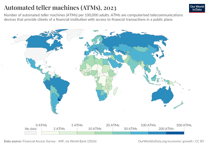 “Data Page: Automated teller machines (ATMs)”. Our World in Data (2026). Data adapted from Financial Access Survey - IMF, via World Bank. Retrieved from https://bespoke-income-plots.owid.pages.dev/grapher/automated-teller-machines-atms-per-100000-adults [online resource]How to cite this data