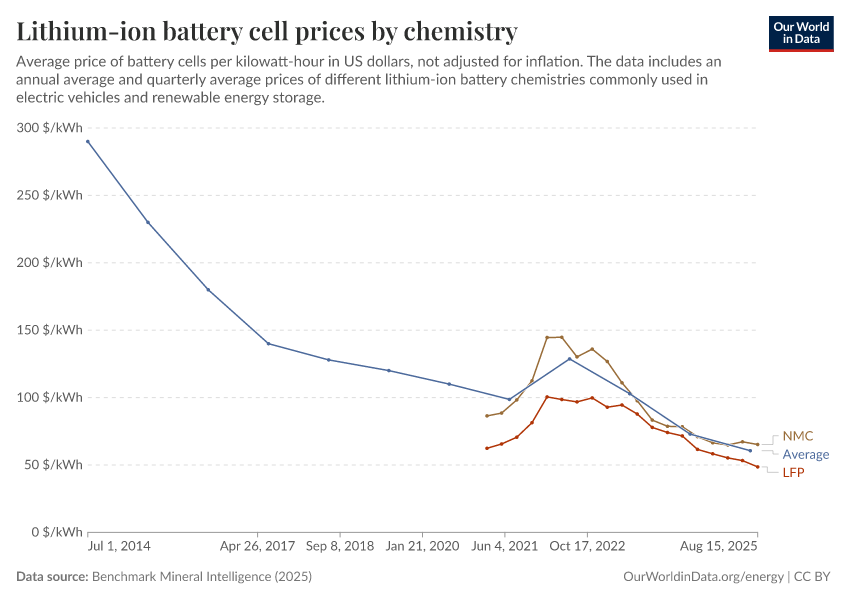 “Data Page: Lithium-ion battery cell prices by chemistry”, part of the following publication: Hannah Ritchie, Pablo Rosado, and Max Roser (2023) - “Energy”. Data adapted from Benchmark Mineral Intelligence. Retrieved from https://bespoke-income-plots.owid.pages.dev/grapher/average-battery-cell-price [online resource]How to cite this data