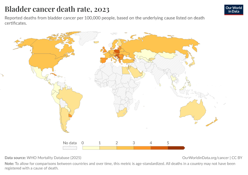 WHO Mortality Database (2025) – with minor processing by Our World in Data. “Bladder cancer death rate” [dataset]. WHO Mortality Database, “WHO Mortality Database” [original data]. Retrieved March 12, 2026 from https://bespoke-income-plots.owid.pages.dev/grapher/bladder-cancer-death-rate