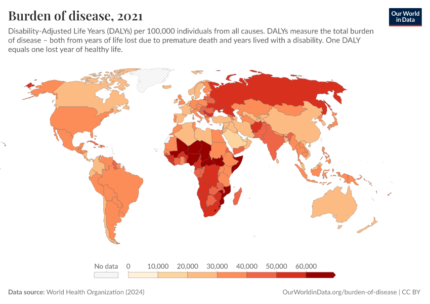 “Data Page: Burden of disease”, part of the following publication: Esteban Ortiz-Ospina and Max Roser (2016) - “Global Health”. Data adapted from World Health Organization. Retrieved from https://bespoke-income-plots.owid.pages.dev/grapher/burden-of-disease-who [online resource]How to cite this data