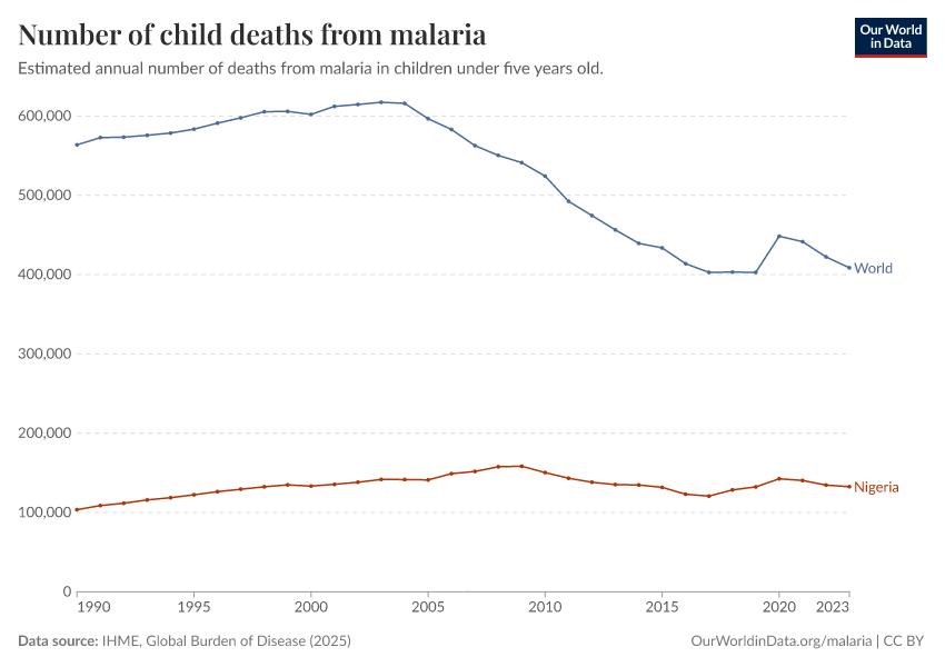 IHME, Global Burden of Disease (2025) – with major processing by Our World in Data. “Number of child deaths from malaria” [dataset]. IHME, Global Burden of Disease, “Global Burden of Disease - Deaths” [original data]. Retrieved March 12, 2026 from https://bespoke-income-plots.owid.pages.dev/grapher/child-deaths-from-malaria-number