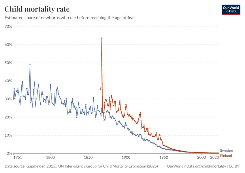 Gapminder (2015); UN Inter-agency Group for Child Mortality Estimation (2025) – processed by Our World in Data. “Child mortality rate – Gapminder; UN IGME – Long-run data” [dataset]. United Nations Inter-agency Group for Child Mortality Estimation, “United Nations Inter-agency Group for Child Mortality Estimation”; Gapminder, “Child mortality rate under age five v7”; Gapminder based on UN IGME & UN WPP, “Under-five Mortality v11”; Various sources, “Population” [original data]. Retrieved March 12, 2026 from https://bespoke-income-plots.owid.pages.dev/grapher/child-mortality