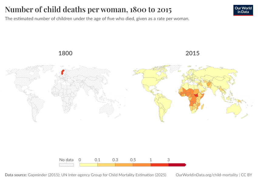 Gapminder (2015); UN Inter-agency Group for Child Mortality Estimation (2025) – processed by Our World in Data. “Child mortality rate – Gapminder; UN IGME – Long-run data” [dataset]. United Nations Inter-agency Group for Child Mortality Estimation, “United Nations Inter-agency Group for Child Mortality Estimation”; Gapminder, “Child mortality rate under age five v7”; Gapminder based on UN IGME & UN WPP, “Under-five Mortality v11”; United Nations, “World Population Prospects”; Gapminder, “Babies per woman (total fertility rate) v12”; Various sources, “Population” [original data]. Retrieved March 12, 2026 from https://bespoke-income-plots.owid.pages.dev/grapher/children-died-before-five-per-woman