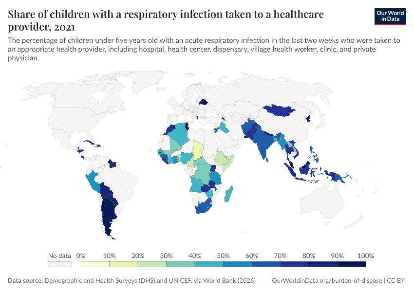 “Data Page: Share of children with a respiratory infection taken to a healthcare provider ”. Our World in Data (2026). Data adapted from Demographic and Health Surveys (DHS) and UNICEF, via World Bank. Retrieved from https://bespoke-income-plots.owid.pages.dev/grapher/children-treated-ari [online resource]How to cite this data