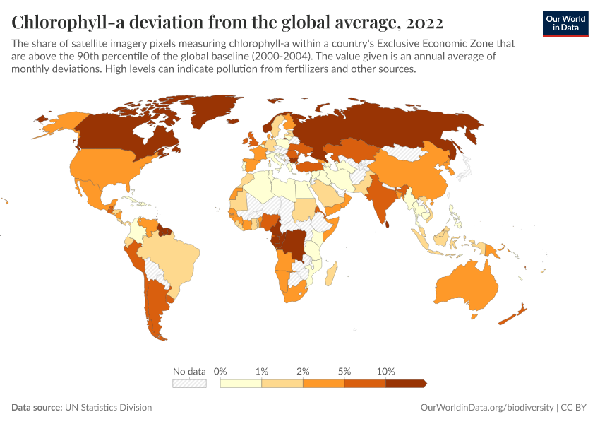 “Data Page: Chlorophyll-a deviation from the global average”. Our World in Data (2026). Data adapted from UN Statistics Division. Retrieved from https://bespoke-income-plots.owid.pages.dev/grapher/chlorophyll-a-deviation-from-the-global-average [online resource]How to cite this data