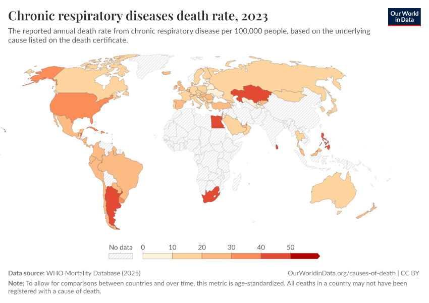 “Data Page: Chronic respiratory diseases death rate”, part of the following publication: Saloni Dattani, Fiona Spooner, Hannah Ritchie, and Max Roser (2023) - “Causes of Death”. Data adapted from WHO Mortality Database. Retrieved from https://bespoke-income-plots.owid.pages.dev/grapher/chronic-respiratory-diseases-death-rate-who-mdb [online resource]How to cite this data
