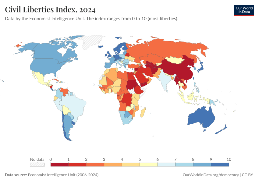 Economist Intelligence Unit (2006-2024) – processed by Our World in Data. “Civil Liberties Index” [dataset]. Economist Intelligence Unit, “Democracy Index 2021: The China challenge”; Economist Intelligence Unit, “Democracy Index 2022: Frontline democracy and the battle for Ukraine”; Economist Intelligence Unit, “Democracy Index 2023: Age of Conflict”; Economist Intelligence Unit, “Democracy Index 2024: What's wrong with representative democracy?”; Gapminder, “Democracy Index v4”; Various sources, “Population” [original data]. Retrieved March 12, 2026 from https://bespoke-income-plots.owid.pages.dev/grapher/civil-liberties-index-eiu