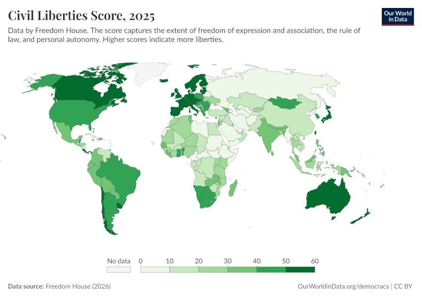Freedom House (2025) – processed by Our World in Data. “Civil Liberties Score” [dataset]. Freedom House, “Freedom in the World” [original data]. Retrieved March 12, 2026 from https://bespoke-income-plots.owid.pages.dev/grapher/civil-liberties-score-fh