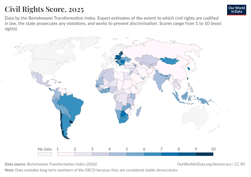 Bertelsmann Transformation Index (2024) – processed by Our World in Data. “Civil Rights Score” [dataset]. Bertelsmann Transformation Index, “Bertelsmann Transformation Index, Scores” [original data]. Retrieved March 12, 2026 from https://bespoke-income-plots.owid.pages.dev/grapher/civil-rights-score-bti