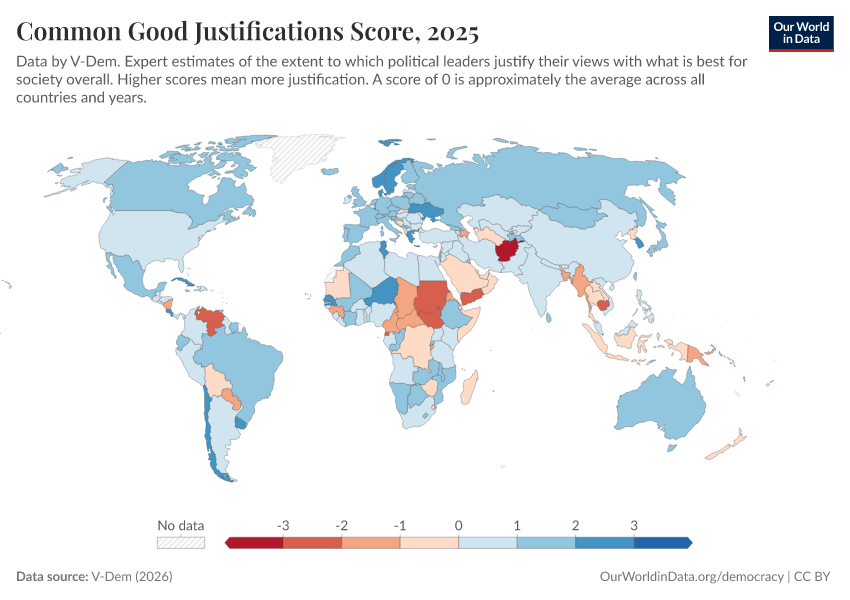 “Data Page: Common good justifications”, part of the following publication: Bastian Herre, Lucas Rodés-Guirao, and Esteban Ortiz-Ospina (2013) - “Democracy”. Data adapted from V-Dem. Retrieved from https://bespoke-income-plots.owid.pages.dev/grapher/common-good-justifications-score [online resource]How to cite this data