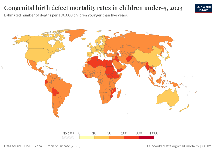 IHME, Global Burden of Disease (2025) – with major processing by Our World in Data. “Congenital birth defect mortality rates in children under-5” [dataset]. IHME, Global Burden of Disease, “Global Burden of Disease - Deaths” [original data]. Retrieved March 12, 2026 from https://bespoke-income-plots.owid.pages.dev/grapher/congenital-birth-defect-mortality-rates-in-children-under-5