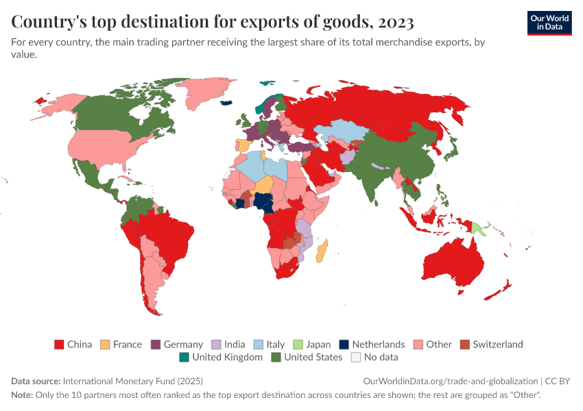 International Monetary Fund (2025) – with major processing by Our World in Data. “Top export partner category” [dataset]. International Monetary Fund, “International Trade in Goods (by partner country) (IMTS)” [original data]. Retrieved March 12, 2026 from https://bespoke-income-plots.owid.pages.dev/grapher/countrys-top-destination-for-exports-of-goods