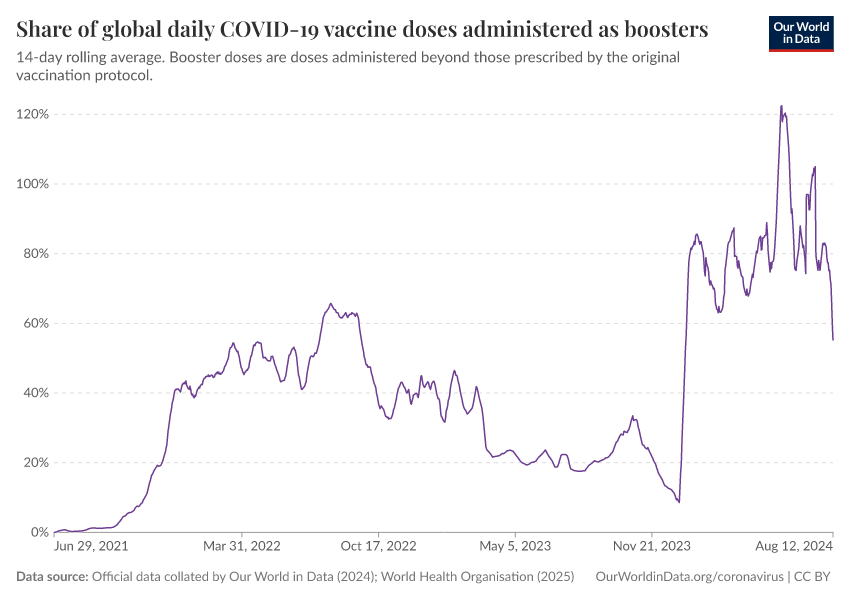 Official data collated by Our World in Data (2024); World Health Organisation (2025) – with major processing by Our World in Data. “Share of global daily COVID-19 vaccine doses administered as boosters” [dataset]. Official data collated by Our World in Data, “COVID-19, vaccinations”; World Health Organisation, “COVID-19, vaccinations (WHO)” [original data]. Retrieved March 12, 2026 from https://bespoke-income-plots.owid.pages.dev/grapher/covid-vaccine-share-boosters