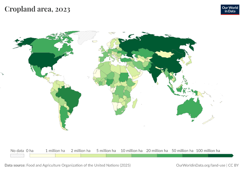 “Data Page: Cropland area”, part of the following publication: Hannah Ritchie, Pablo Rosado, and Max Roser (2023) - “Agricultural Production”. Data adapted from Food and Agriculture Organization of the United Nations. Retrieved from https://bespoke-income-plots.owid.pages.dev/grapher/cropland-area [online resource]
