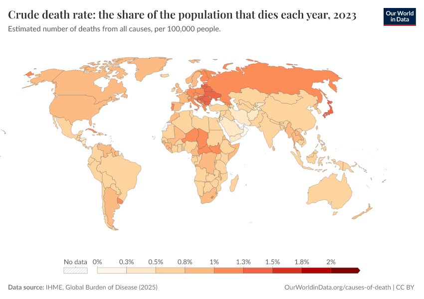 IHME, Global Burden of Disease (2025) – with major processing by Our World in Data. “Crude death rate: the share of the population that dies each year” [dataset]. IHME, Global Burden of Disease, “Global Burden of Disease - Deaths” [original data]. Retrieved March 12, 2026 from https://bespoke-income-plots.owid.pages.dev/grapher/crude-death-rate-the-share-of-the-population-that-dies-each-year-gbd