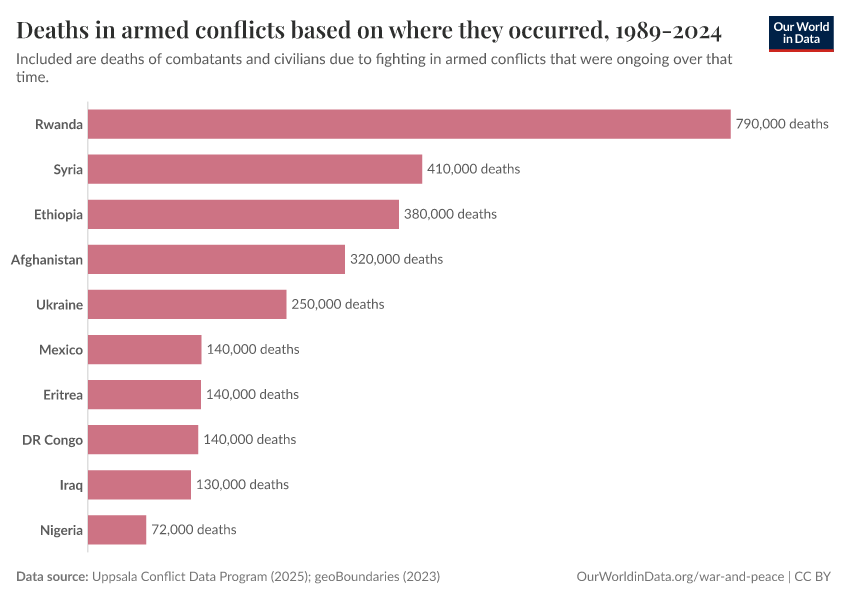 Uppsala Conflict Data Program (2023); Natural Earth (2022) – processed by Our World in Data. “Deaths in armed conflicts based on where they occurred, 1989-2024” [dataset]. Uppsala Conflict Data Program, “Georeferenced Event Dataset (cumulative)”; Natural Earth, “Large scale data (1:10m Cultural Vectors), Admin 0 Countries 5.1.1” [original data]. Retrieved March 12, 2026 from https://bespoke-income-plots.owid.pages.dev/grapher/cumulative-deaths-in-armed-conflicts