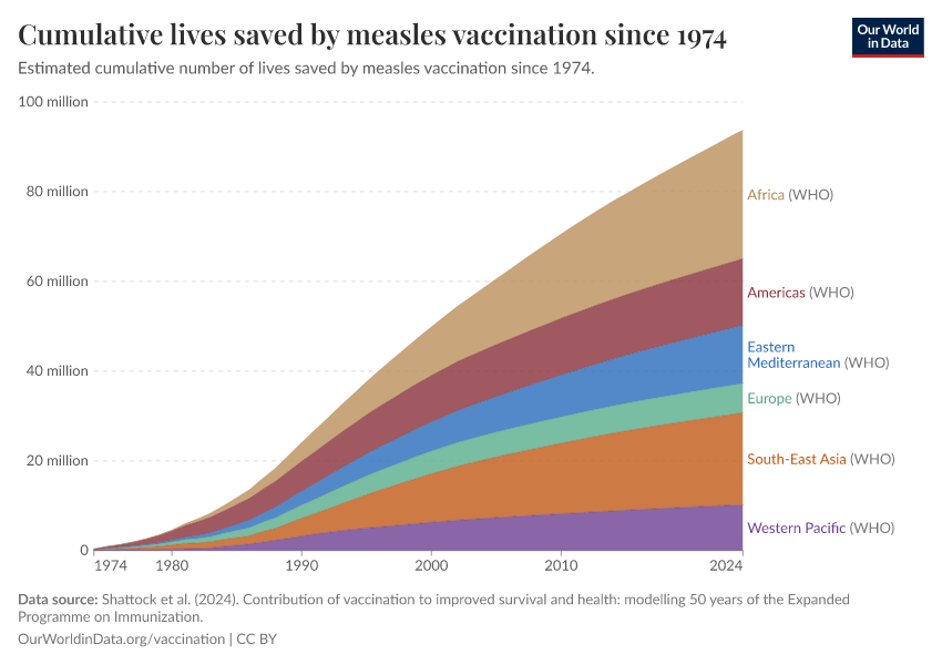 “Data Page: Cumulative lives saved by measles vaccination since 1974”. Our World in Data (2026). Data adapted from Shattock et al. (2024). Contribution of vaccination to improved survival and health: modelling 50 years of the Expanded Programme on Immunization.. Retrieved from https://bespoke-income-plots.owid.pages.dev/grapher/cumulative-lives-saved-by-measles-vaccination-since-1974 [online resource]How to cite this data