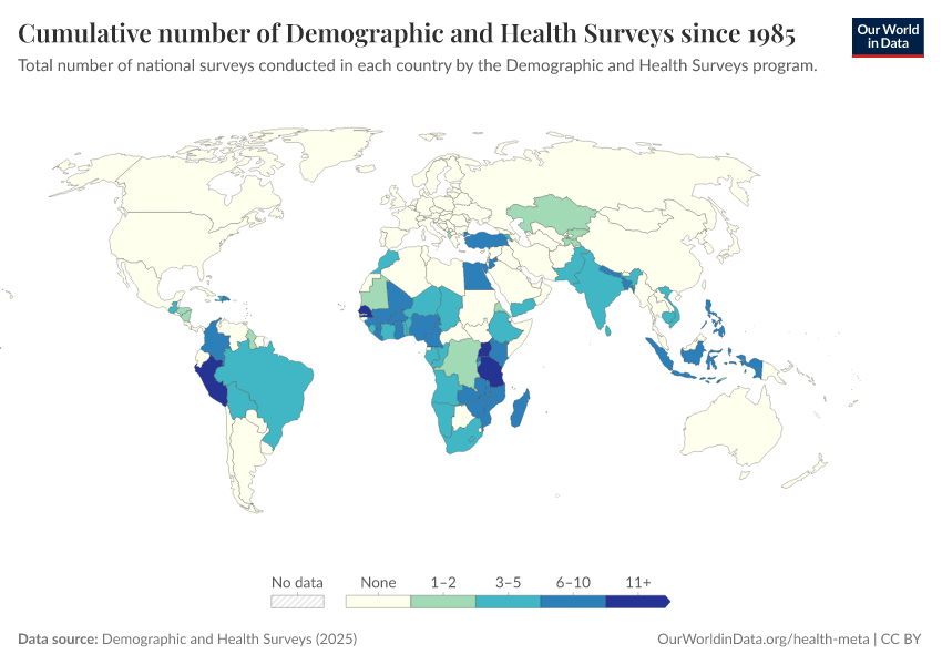 “Data Page: Cumulative number of Demographic and Health Surveys since 1985”. Our World in Data (2026). Data adapted from Demographic and Health Surveys. Retrieved from https://bespoke-income-plots.owid.pages.dev/grapher/cumulative-number-of-dhs-surveys-conducted [online resource]How to cite this data