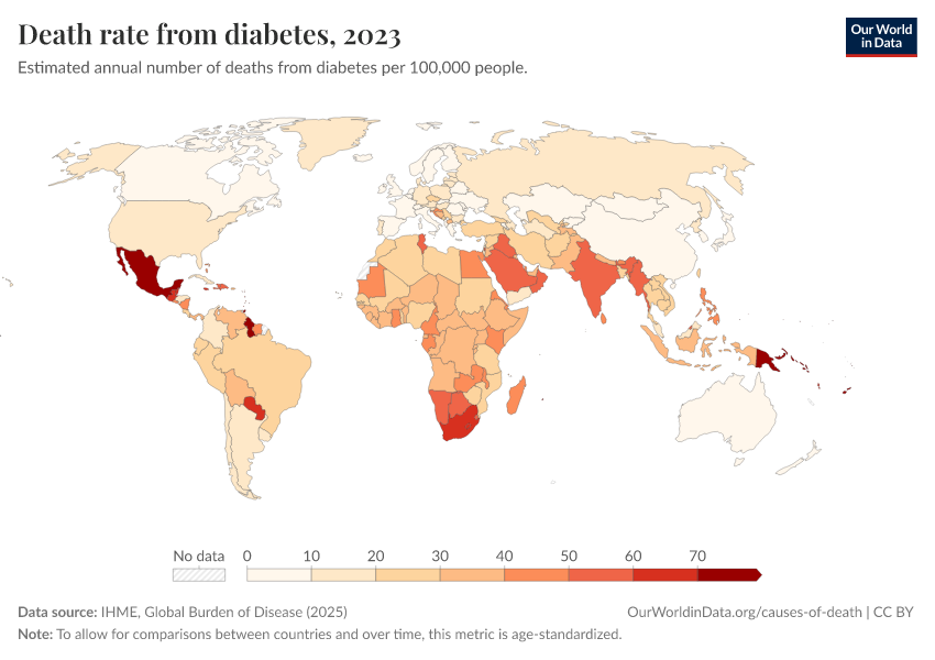 IHME, Global Burden of Disease (2025) – with major processing by Our World in Data. “Death rate from diabetes” [dataset]. IHME, Global Burden of Disease, “Global Burden of Disease - Deaths” [original data]. Retrieved March 12, 2026 from https://bespoke-income-plots.owid.pages.dev/grapher/death-rate-from-diabetes