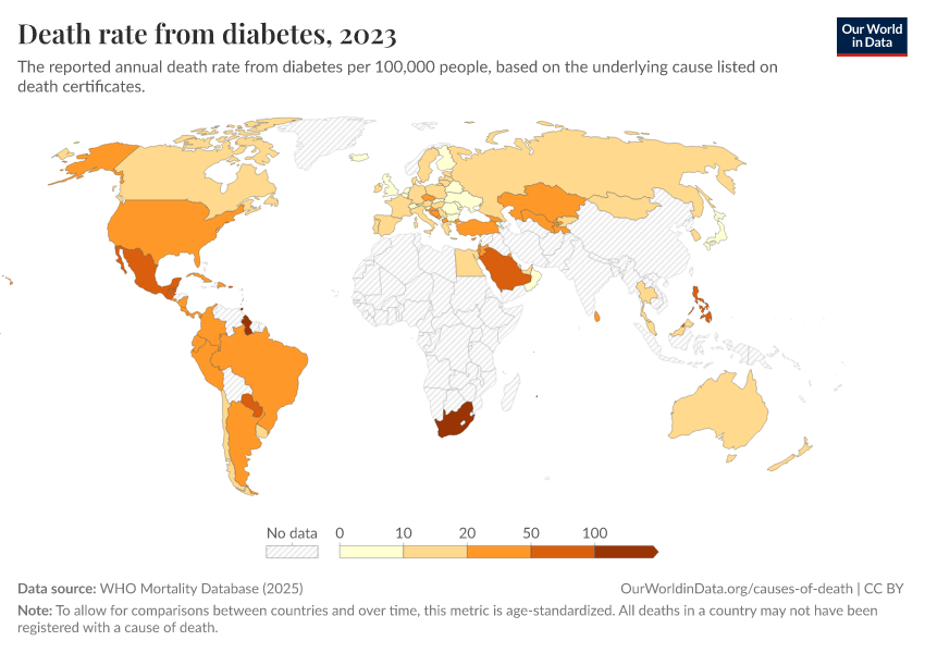 “Data Page: Death rate from diabetes”, part of the following publication: Saloni Dattani, Fiona Spooner, Hannah Ritchie, and Max Roser (2023) - “Causes of Death”. Data adapted from WHO Mortality Database. Retrieved from https://bespoke-income-plots.owid.pages.dev/grapher/death-rate-from-diabetes-who-mdb [online resource]How to cite this data