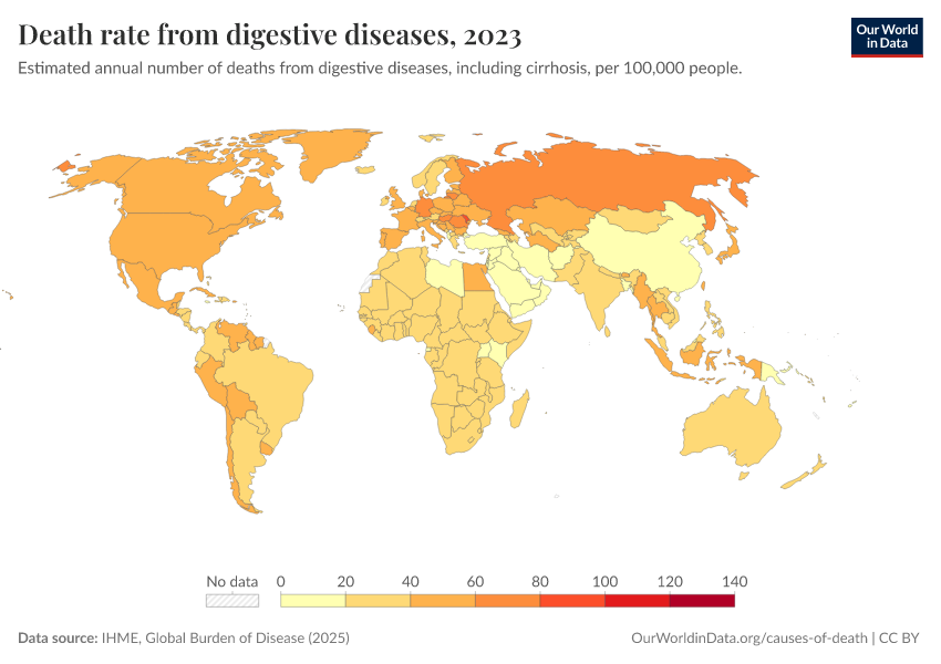 “Data Page: Death rate from digestive diseases”, part of the following publication: Esteban Ortiz-Ospina and Max Roser (2016) - “Global Health”. Data adapted from IHME, Global Burden of Disease. Retrieved from https://bespoke-income-plots.owid.pages.dev/grapher/death-rate-from-digestive-diseases-gbd [online resource]How to cite this data