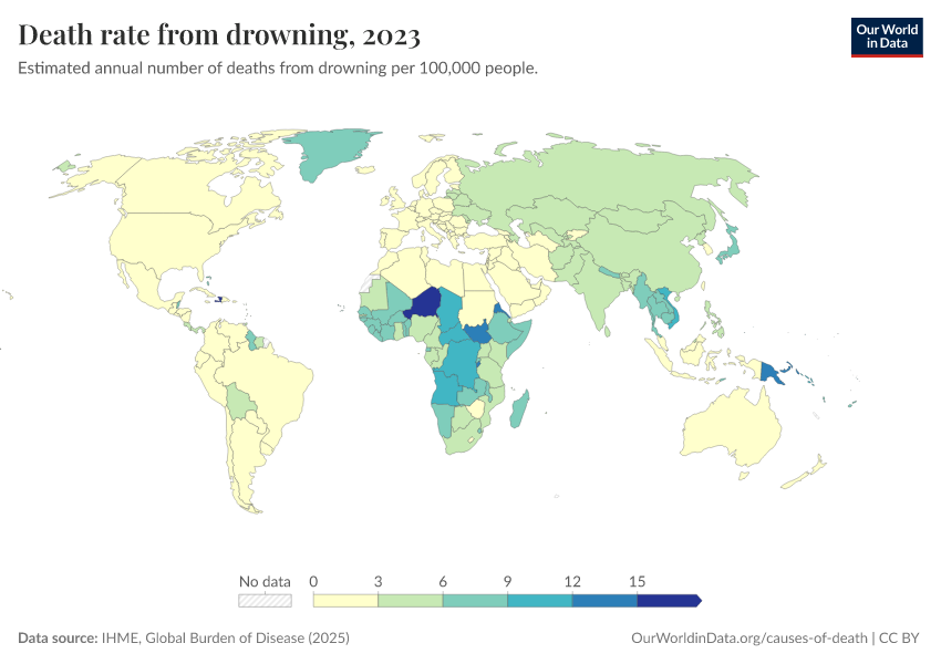 IHME, Global Burden of Disease (2025) – with major processing by Our World in Data. “Death rate from drowning” [dataset]. IHME, Global Burden of Disease, “Global Burden of Disease - Deaths” [original data]. Retrieved March 12, 2026 from https://bespoke-income-plots.owid.pages.dev/grapher/death-rate-from-drowning