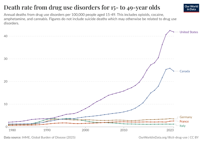 IHME, Global Burden of Disease (2025) – with major processing by Our World in Data. “Death rate from drug use disorders for 15- to 49-year olds” [dataset]. IHME, Global Burden of Disease, “Global Burden of Disease - Deaths” [original data]. Retrieved March 12, 2026 from https://bespoke-income-plots.owid.pages.dev/grapher/death-rate-from-drug-use-disorders-for-15--to-49-year-olds