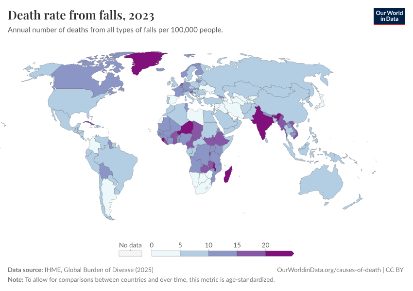 IHME, Global Burden of Disease (2025) – with major processing by Our World in Data. “Death rate from falls” [dataset]. IHME, Global Burden of Disease, “Global Burden of Disease - Deaths” [original data]. Retrieved March 12, 2026 from https://bespoke-income-plots.owid.pages.dev/grapher/death-rate-from-falls-gbd