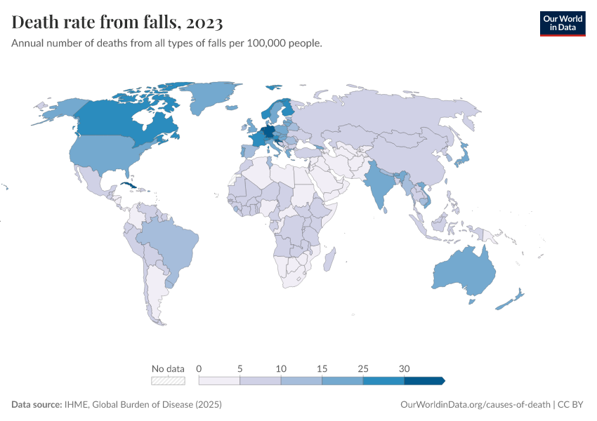 “Data Page: Death rate from falls”, part of the following publication: Esteban Ortiz-Ospina and Max Roser (2016) - “Global Health”. Data adapted from IHME, Global Burden of Disease. Retrieved from https://bespoke-income-plots.owid.pages.dev/grapher/death-rate-from-falls-gbd-rate [online resource]How to cite this data