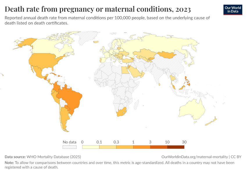 WHO Mortality Database (2025) – with minor processing by Our World in Data. “Death rate from pregnancy or maternal conditions” [dataset]. WHO Mortality Database, “WHO Mortality Database” [original data]. Retrieved March 12, 2026 from https://bespoke-income-plots.owid.pages.dev/grapher/death-rate-from-maternal-disorders