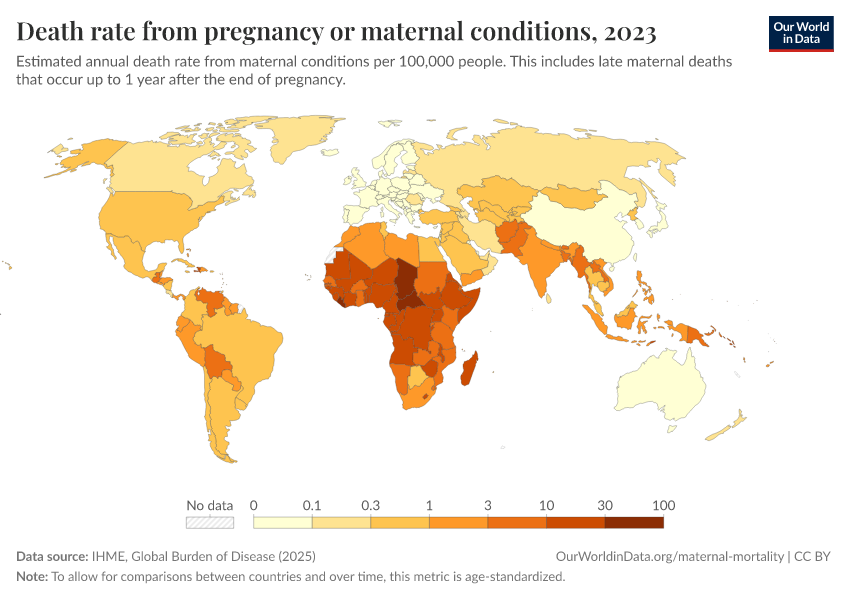 IHME, Global Burden of Disease (2025) – with major processing by Our World in Data. “Death rate from pregnancy or maternal conditions” [dataset]. IHME, Global Burden of Disease, “Global Burden of Disease - Deaths” [original data]. Retrieved March 12, 2026 from https://bespoke-income-plots.owid.pages.dev/grapher/death-rate-from-maternal-disorders-ihme