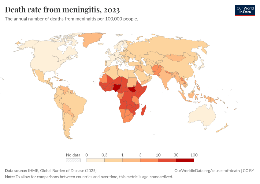 IHME, Global Burden of Disease (2025) – with major processing by Our World in Data. “Death rate from meningitis” [dataset]. IHME, Global Burden of Disease, “Global Burden of Disease - Deaths” [original data]. Retrieved March 12, 2026 from https://bespoke-income-plots.owid.pages.dev/grapher/death-rate-from-meningitis