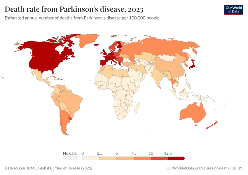 IHME, Global Burden of Disease (2025) – with major processing by Our World in Data. “Death rate from Parkinson's disease” [dataset]. IHME, Global Burden of Disease, “Global Burden of Disease - Deaths” [original data]. Retrieved March 12, 2026 from https://bespoke-income-plots.owid.pages.dev/grapher/death-rate-from-parkinsons-disease-gbd