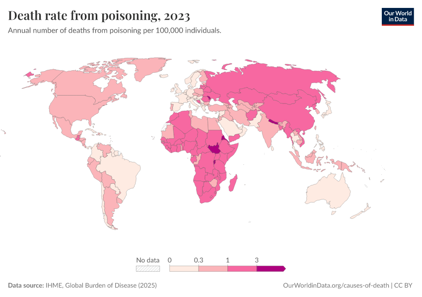 IHME, Global Burden of Disease (2025) – with major processing by Our World in Data. “Death rate from poisoning” [dataset]. IHME, Global Burden of Disease, “Global Burden of Disease - Deaths” [original data]. Retrieved March 12, 2026 from https://bespoke-income-plots.owid.pages.dev/grapher/death-rate-from-poisoning-gbd