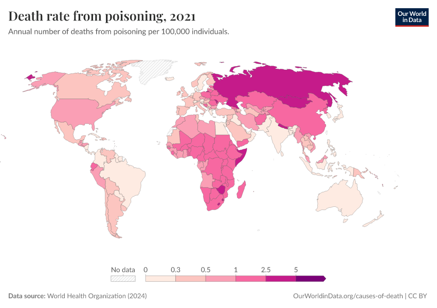 World Health Organization (2024) – with major processing by Our World in Data. “Death rate from poisoning” [dataset]. World Health Organization, “Global Health Estimates” [original data]. Retrieved March 12, 2026 from https://bespoke-income-plots.owid.pages.dev/grapher/death-rate-from-poisoning-ghe